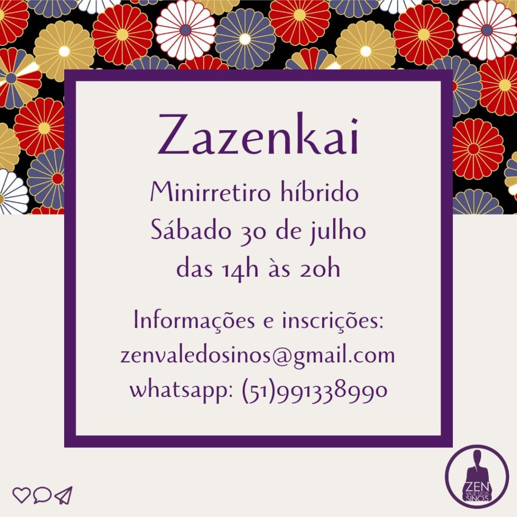 Como participar do Zazenkai? Inicialmente você envia um email para zenvaledossinos@gmail.com ou uma mensagem para o Whatsapp (51)991338990, demonstrando interesse em participar. Na sequência você receberá as orientações para efetivar a sua inscrição.